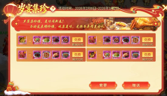 2026年2月6日10:00-2026年3月2日23:59期间,与好友互赠珍馐,收集美味,兑换各类精美好礼!