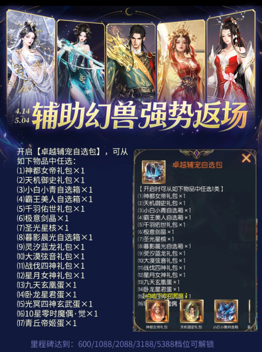 独行快,众行远,而在亚特大陆,有强力辅宠相伴方能战无不胜!为了助力各位神选者快速提升战力,本次活动特别推出了里程碑奖励。当你积累的数值达到600、1088、2088、3188及5388档位时,即可解锁【卓越辅宠自选包】。
