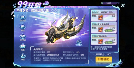 活动期间,满足条件的神选者可在“99狂飙”界面进行匹配,单场比赛将匹配6人进行摩托竞速,合理使用摩托技能与赛场内道具、躲避场地陷阱,竞逐排名。比赛结束时,将依据排名获得相应奖励。